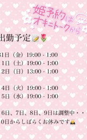 全記事を表示 本日出勤の女の子 新人の女の子 名前で絞る このページではJavaScriptを使用しています。 11/1 14:00~ 10/31UP 映画「国宝」 長澤せんり 20:00~21:30 10/31UP ハロウィン? 天海あんな 22:00~翌4:00 10/31UP ハピハロ~! 横山らいむ 17:00~23:00 10/31UP お礼?本指さま?? 仲川るな 13:00~17:00 10/31UP 本指名☆K様へ★ 白星きずな 13:00~17:00 10/31UP 本指名☆K様へ★ 白星きずな 11/1 13:00~ 10/31UP 明日 小泉りせ 15:00~05:00 10/31UP ぬくぬくしようよ 早瀬まち 12:00~15:00 10/31UP 10/31 ハロウィン? 八木みつき 15:00~05:00 10/31UP 緊急! 早瀬まち 19:00~翌1:00 10/30UP 消されませんように 穂高みら 17:00~23:00 10/30UP お礼? 仲川るな 17:00~23:00 10/30UP お礼?本指さま?? 仲川るな 17:00~23:00 10/30UP お礼? 仲川るな 11/1 14:00~ 10/30UP ごめんなさい 長澤せんり 19:00~翌1:00 10/30UP ●??お知らせ??● 穂高みら 11/1 10:00~ 10/18入店 10/30UP 明日は...??? 逃げ水かずは 19:00~翌1:00 10/30UP ゲリラ出勤! 穂高みら 11/1 14:00~ 10/30UP 岡〇斗司夫 長澤せんり 11/1 17:00~ 10/26入店 10/30UP N様ありがとうござい 梅沢とうか もっと見る 全記事を表示 本日出勤の女の子 新人の女の子 名前で絞る